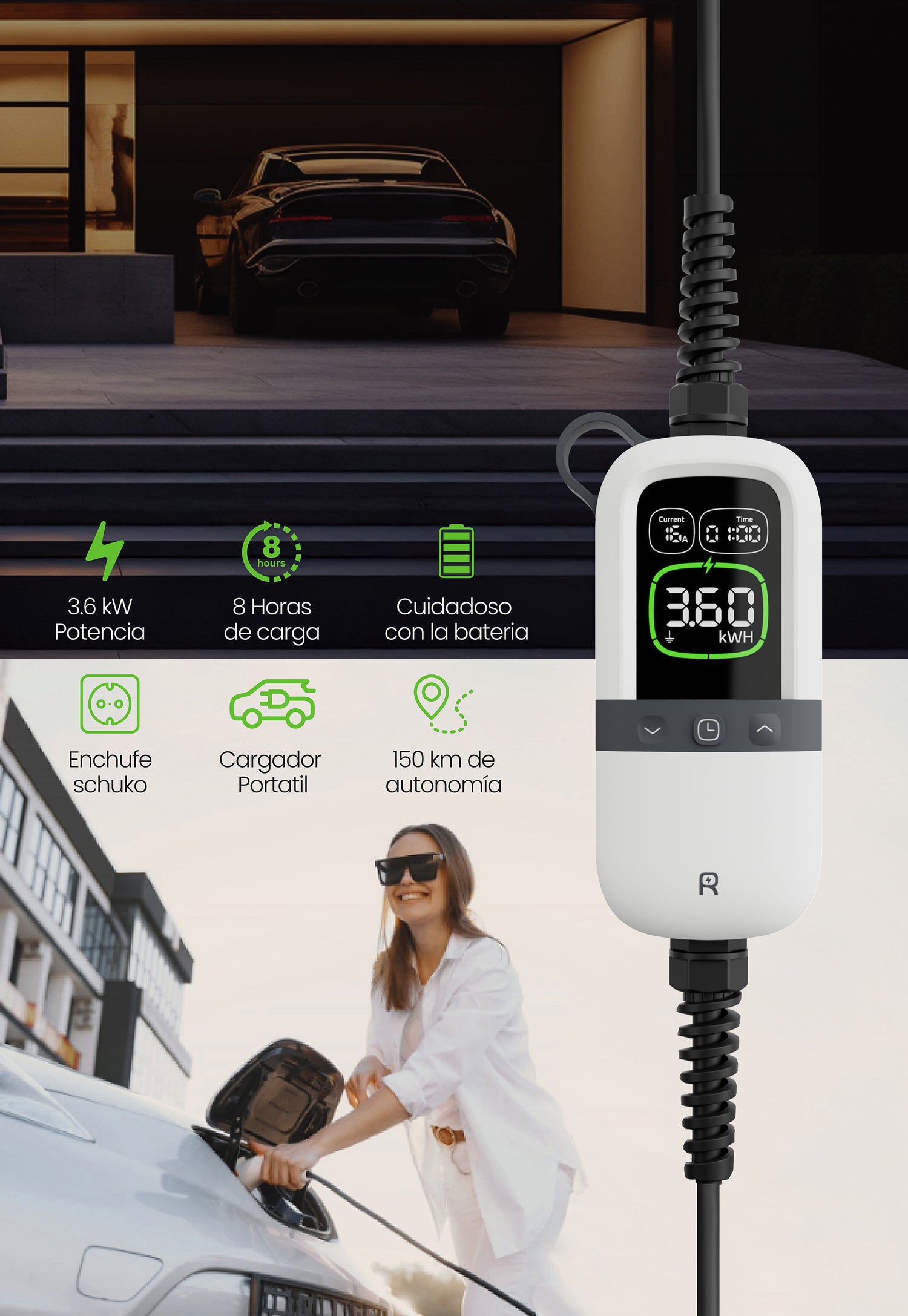 El cable de carga de 7.5 m permite una carga flexible incluso en espacios de estacionamiento distantes, lo que lo hace ideal tanto para interiores como exteriores.