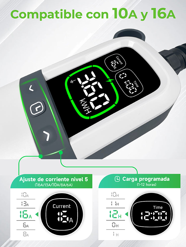 Diseñado para ofrecer la máxima portabilidad, este cargador EV puede guardarse fácilmente en una bolsa de viaje. Su tamaño compacto y su diseño ligero lo convierten en el compañero ideal para desplazamientos y viajes. Disfrute de una comodidad sin complicaciones: sólo tiene que cogerlo y listo.