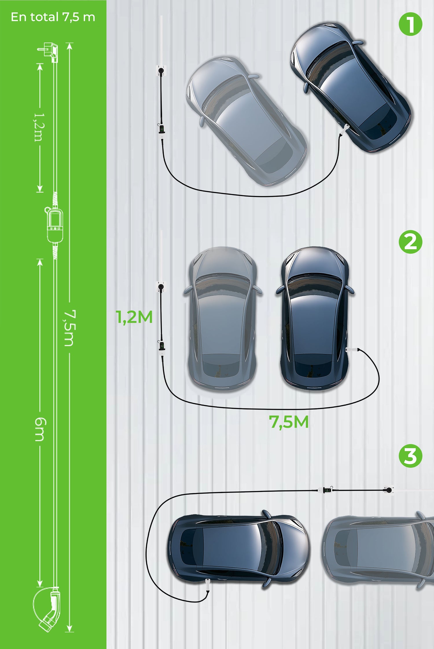 La longitud del cable está basada en la distancia entre la base de carga y el enchufe del vehículo.Recomendado. Longitud del vehículo + 1,5m/2m= longitud del cable. La longitud total de 7,5m encaja con la mayoría de las aplicaciones de carga, tanto caseras como temporalmente al aire libre.