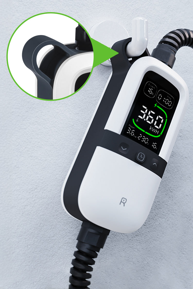 Este cargador EV viene con un gancho integrado para poder colgarlo fácilmente mientras se utiliza. Ofrece flexibilidad en diferentes entornos de carga y garantiza el ahorro de espacio y un uso ordenado.