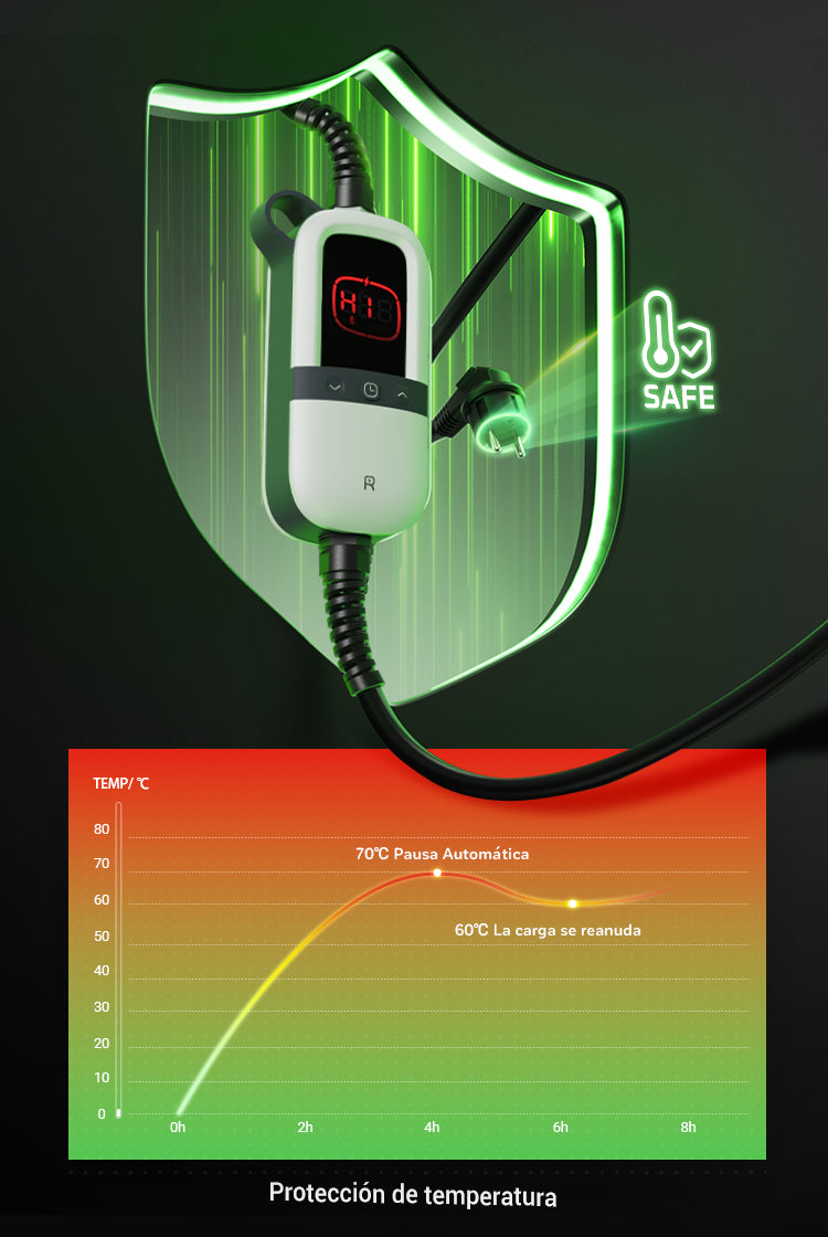 La carga se detiene automáticamente si la temperatura del enchufe supera los 70 ºC y se reanuda cuando se enfría a 60 ºC, para que las sesiones de carga prolongadas de tu familia sean seguras y frescas.