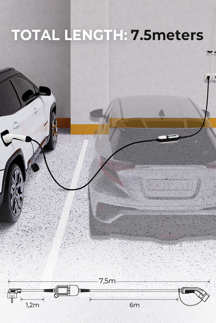 El cable de carga de 7.5 m permite una carga flexible incluso en espacios de estacionamiento distantes, lo que lo hace ideal tanto para interiores como exteriores.