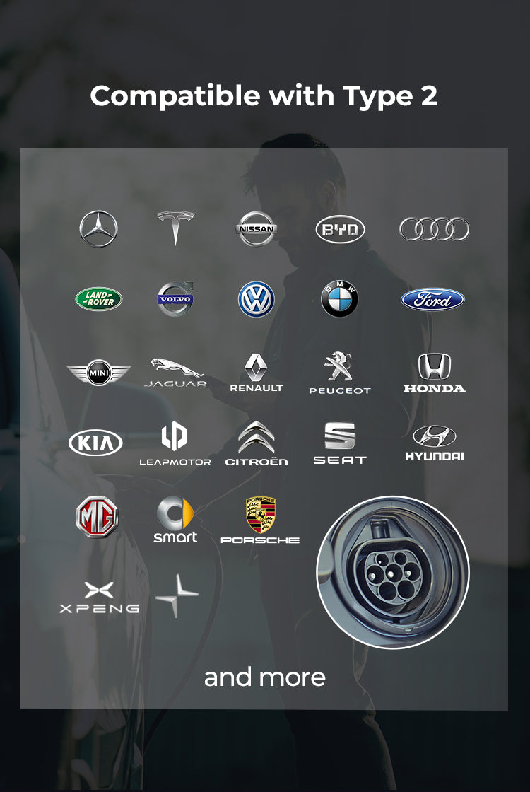 El conector Tipo 2 garantiza una amplia compatibilidad con los principales vehículos eléctricos de Europa.