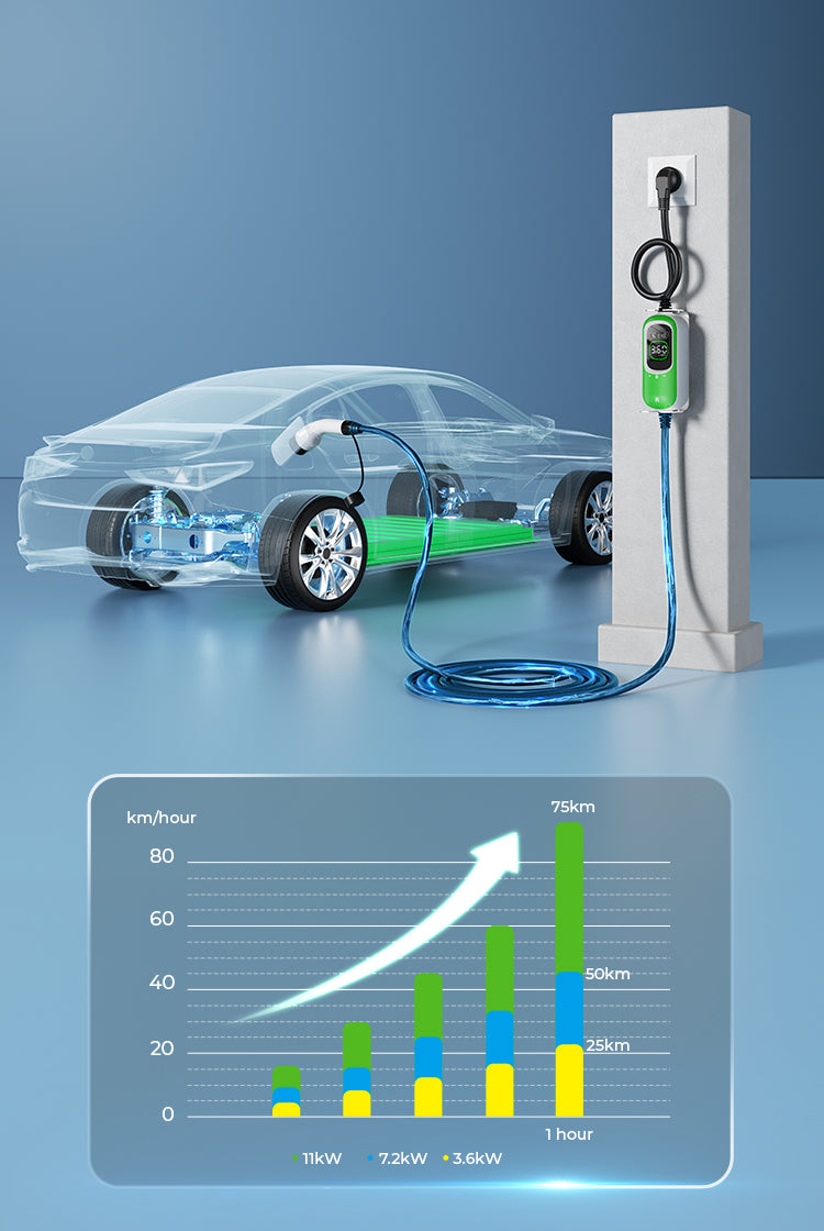 Carregue até 25 quilômetros de autonomia por hora, garantindo que seu veículo esteja sempre pronto quando você precisar. Perfeito para recargas rápidas durante o horário de trabalho ou para carregamento confiável em viagens em família. Mesmo uma curta sessão de carregamento fornece bateria suficiente para continuar sua viagem sem problemas.